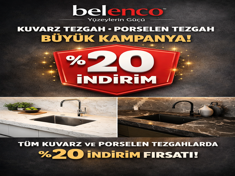 Mutfak ve yaşam alanlarınıza estetik, dayanıklılık ve kalite katan Belenco tezgah modellerinde büyük kampanya başladı! Şimdi tüm kuvars tezgah ve porselen tezgah çeşitlerinde %20 indirim fırsatını kaçırmayın.